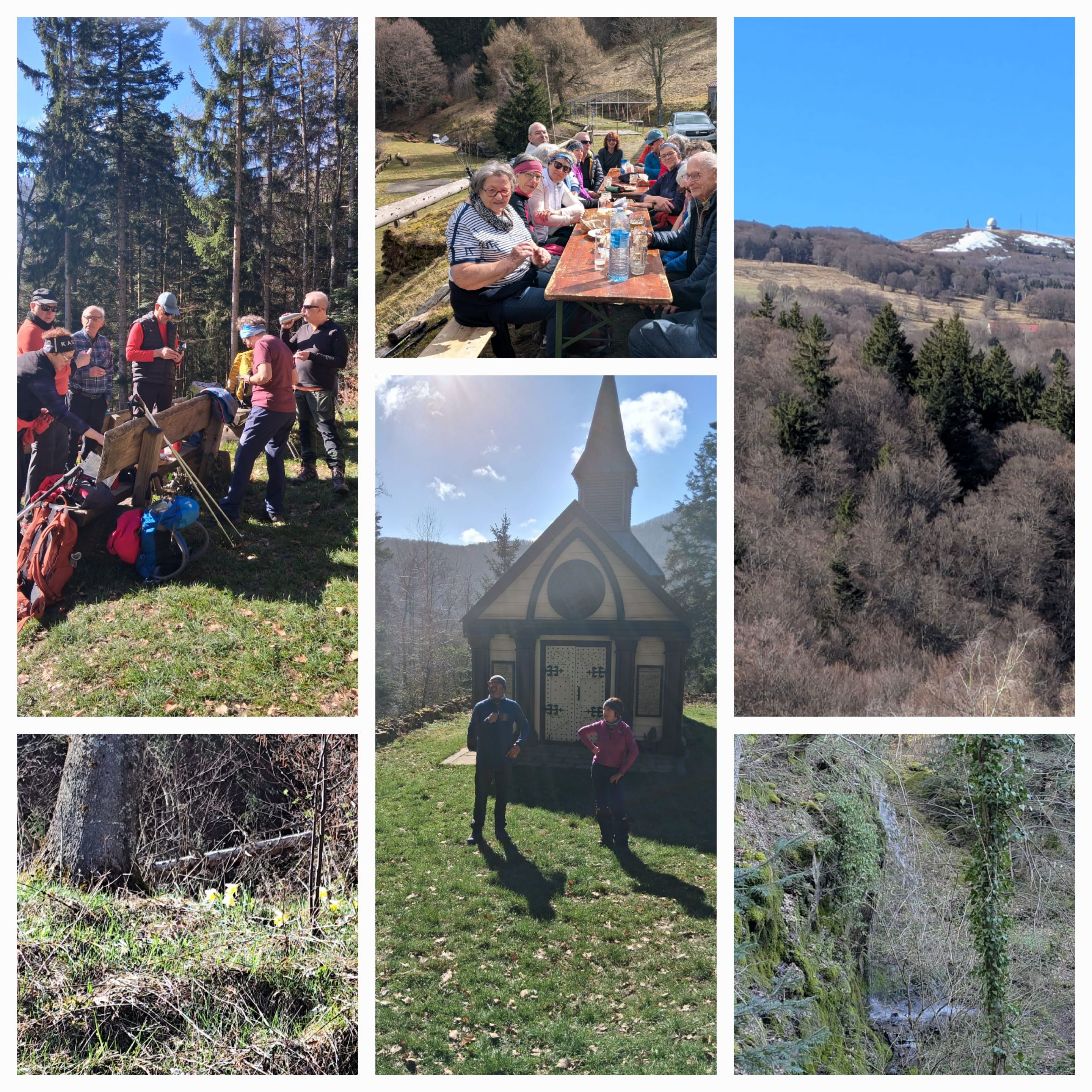 Le 19 mars au refuge du Treh après avoir randonné sous la pluie puis 2 fois avec des températures estivales, nous voici partis un groupe de Ranspach, un autre du Markstein et un invité surprise : un vent glacial dont on se serait bien passé !! Malgré une belle grimpette nous n avons pas eu trop chaud et la pause boissons chaudes ( et autre douceur) a été appréciée…Idem pour le 2ème groupe qui a du bien s accrocher en sortant des voitures…Bravo à Missy et JJacques pour leur persévérance Heureusement l accueil fût chaleureux et, bien placés derrière les baies vitrées au soleil, nous avons apprécier encore plus la bonne soupe de légumes !! Le retour au vent pour certains et la longue descente pour les autres n a pas entaché notre plaisir de nous retrouver une fois de plus pour marcher et passer un bon moment ensemble.. Le 26 mars au Boedelen Si un bon nombre d entre nous connaissions l emplacement de ce refuge, c est la 1ère fois que nous y sommes allés dans le cadre des ouvertures en semaine … Départ de Sewen ou du lac d Alfeld, belle montée en passant par le Petit et Grand Langelberg. Avons marché dans la neige fraîche ( près de 10 cm par endroit ) mais n avions pas les skis pour descendre la piste…Dommage car elle paraît sympa et cela aurait été plus rapide !! Nous avions en ligne de mire le refuge où nous attendait déjà un petit groupe à leur 2ème apéro… Sommes arrivés vers 12h45 et n étions même pas les derniers !! Très bon accueil, très jolie salle refaite depuis peu. Descente par le lac d Alfeld puis les cascades et retour aux voitures, crevés mais contents comme d habitude..ça fait plaisir de…