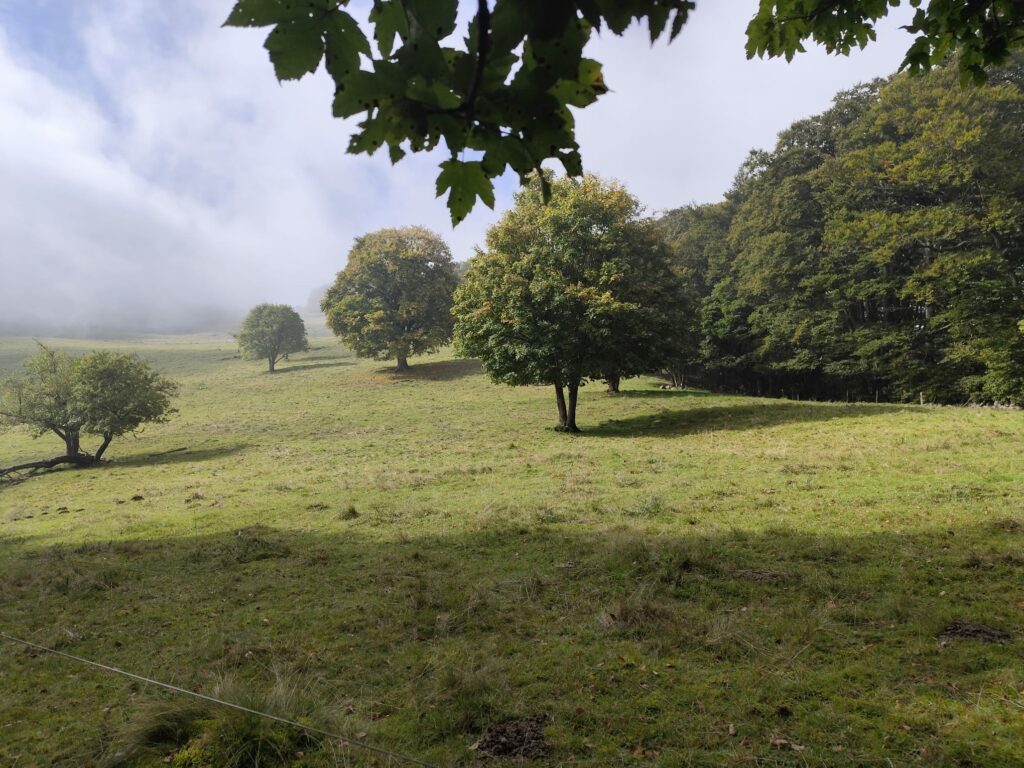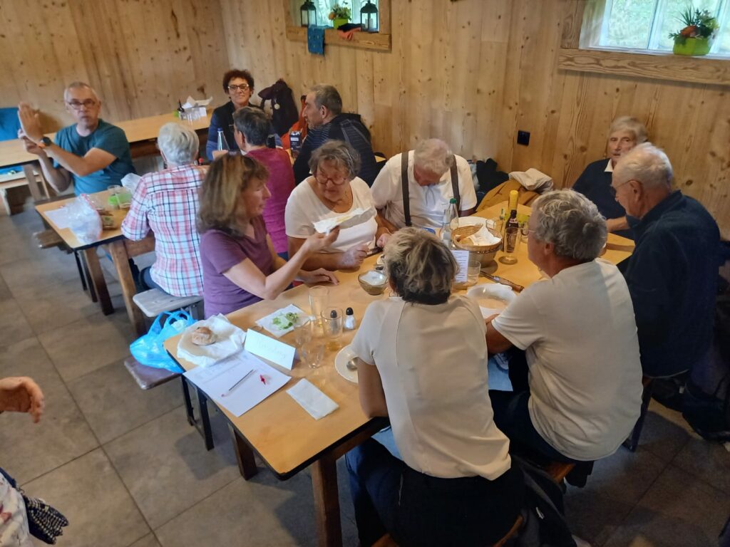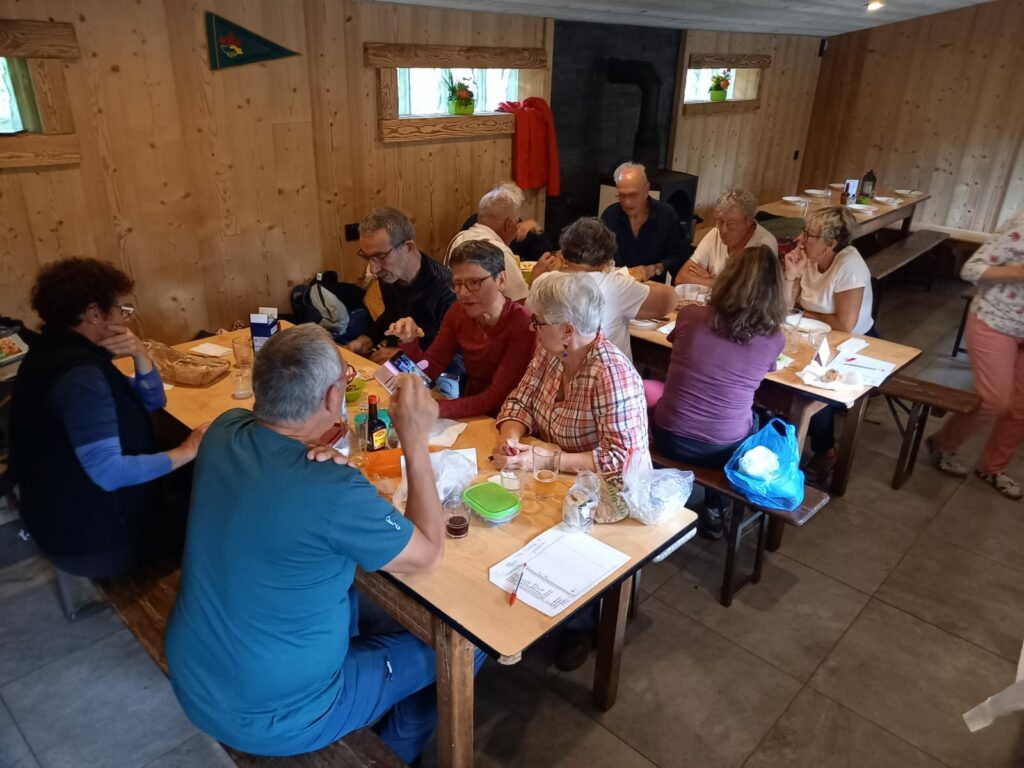 Départ du monument Brun à Sengern. Pas de pluie mais temps frais car très très humide et encore du brouillard…Montée au lac du Ballon ou la pause café-tisane s est faite accompagnée de 2 brioches !! Sans le savoir, nous avons fait des réserves puisque nous sommes arrivés au refuge à 13h, en bons derniers !! Nous y retrouvons Missi, Michel S et les 2 JJacques partis eux, du Markstein…